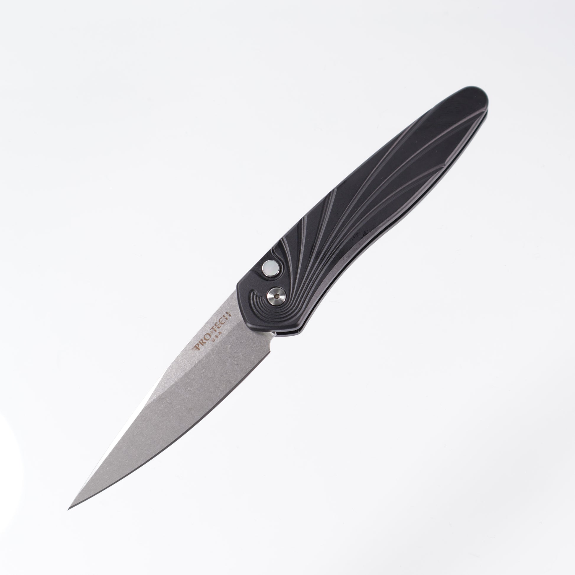 Protech Newport 3436 - Black Handle w/ 3D Wave milling & Mother Of Pearl button - Stonewash S35VN
