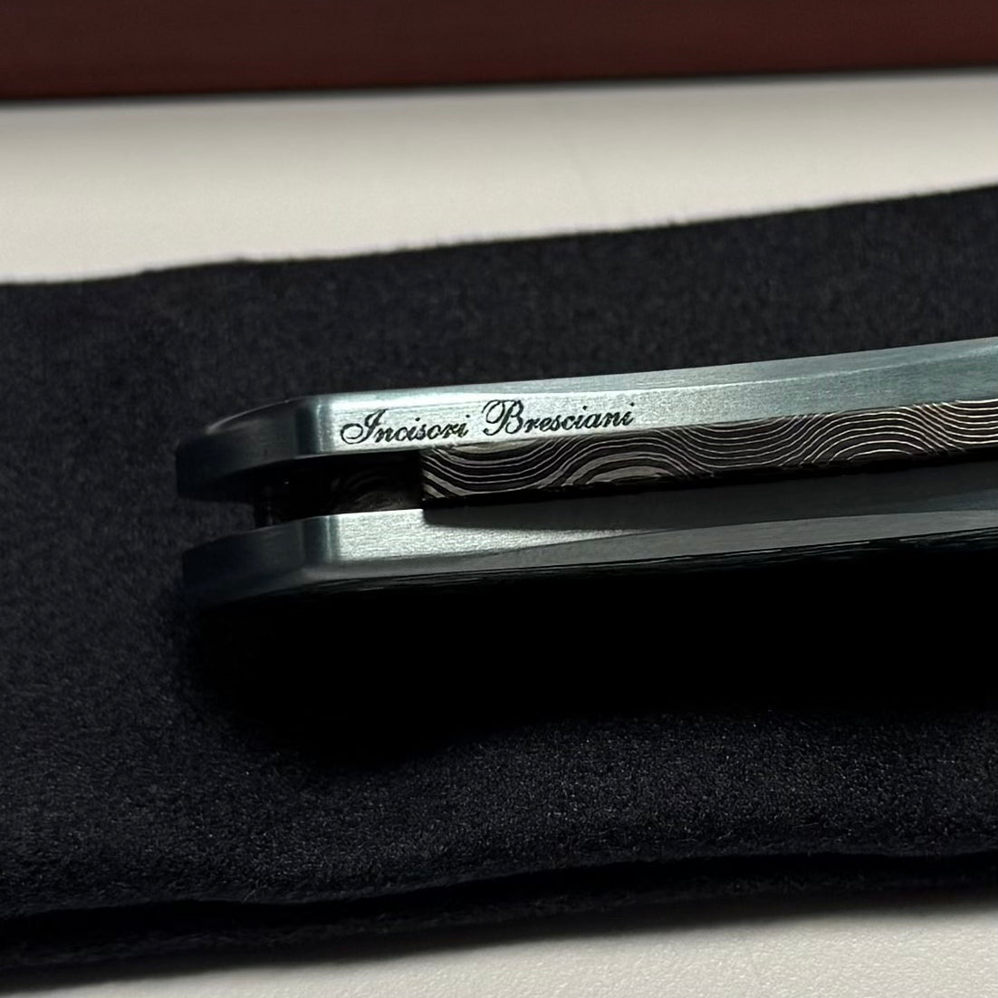 Protech Newport Ultimate Custom teal titanium, MOP button & inlay, 24k gold detailing, reptilian Damascus blade & hand engraving by Bottega Incision