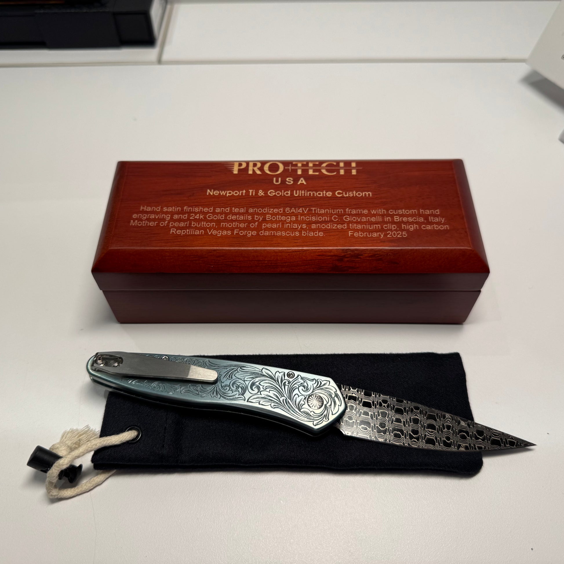 Protech Newport Ultimate Custom featuring a hand satin teal anodized titanium frame, Mother of pearl button & inlay, 24k gold detailing, Vegas Forge reptilian Damascus blade & beautiful hand engraving by Bottega Incisioni!