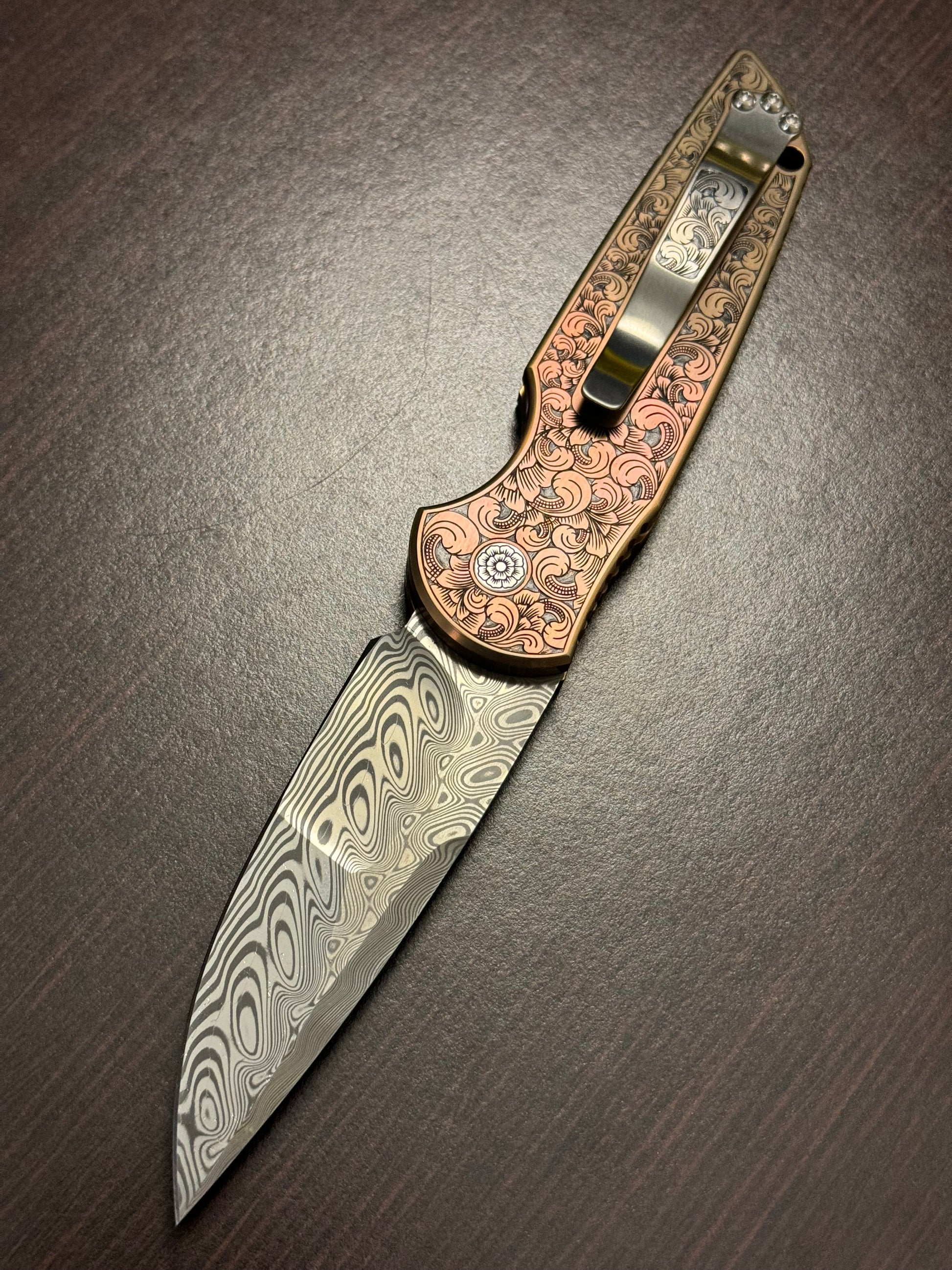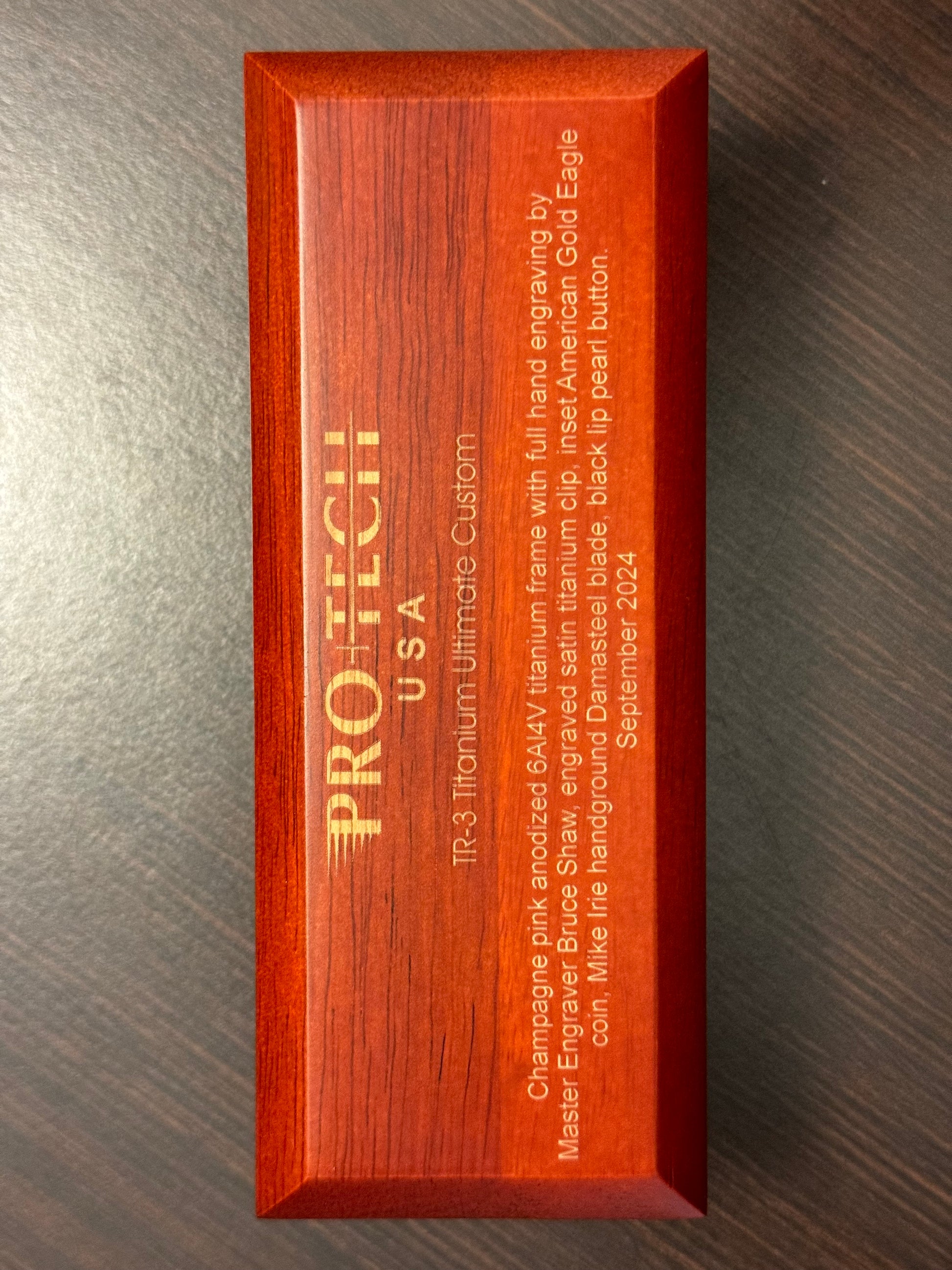 Protech Pro-Tech 2024 TR-3 Custom 002 Champagne Pink Ti Frame Bruce Shaw Hand Engraving with American Eagle Gold Coin, Irie Ground Damasteel Blade