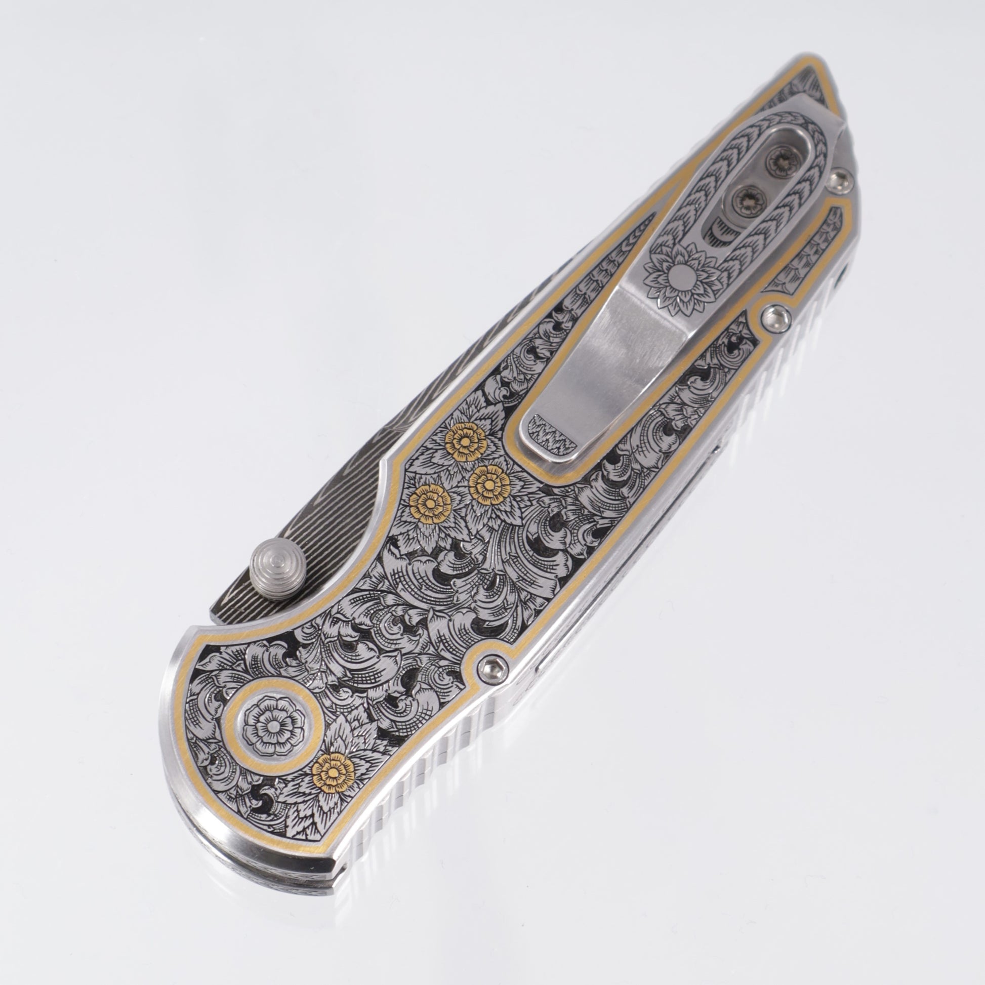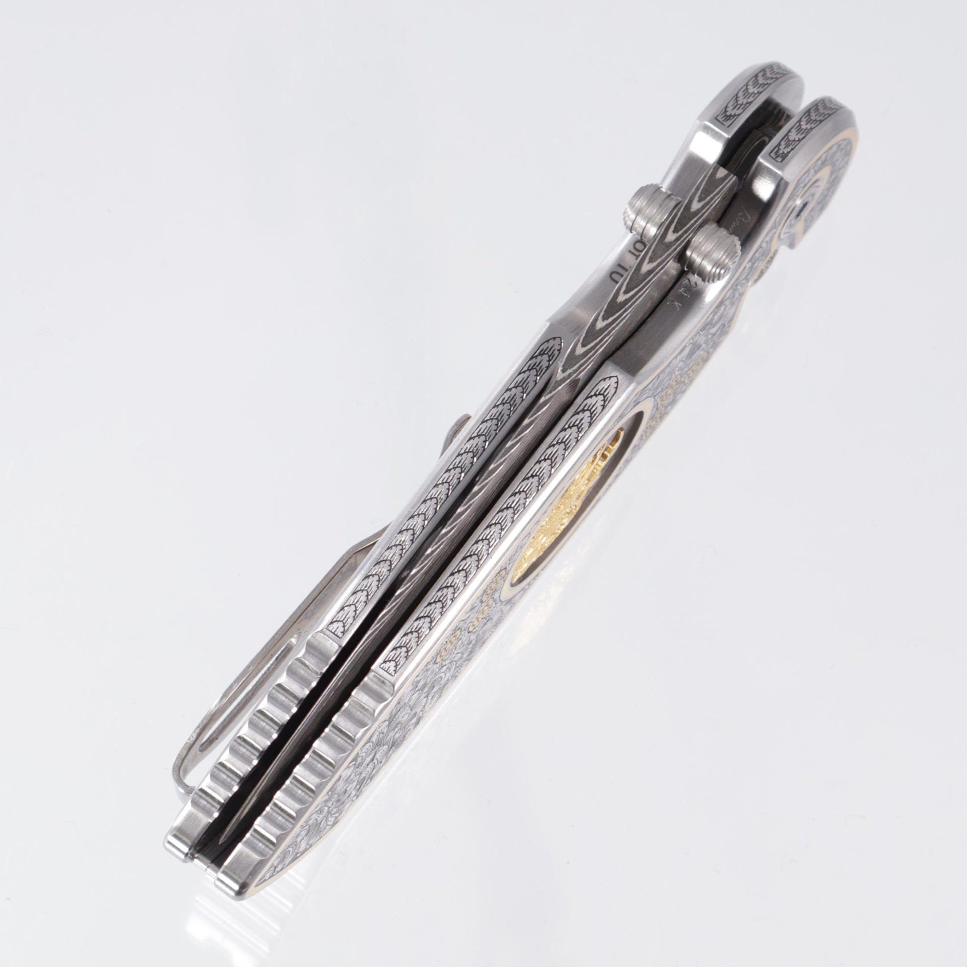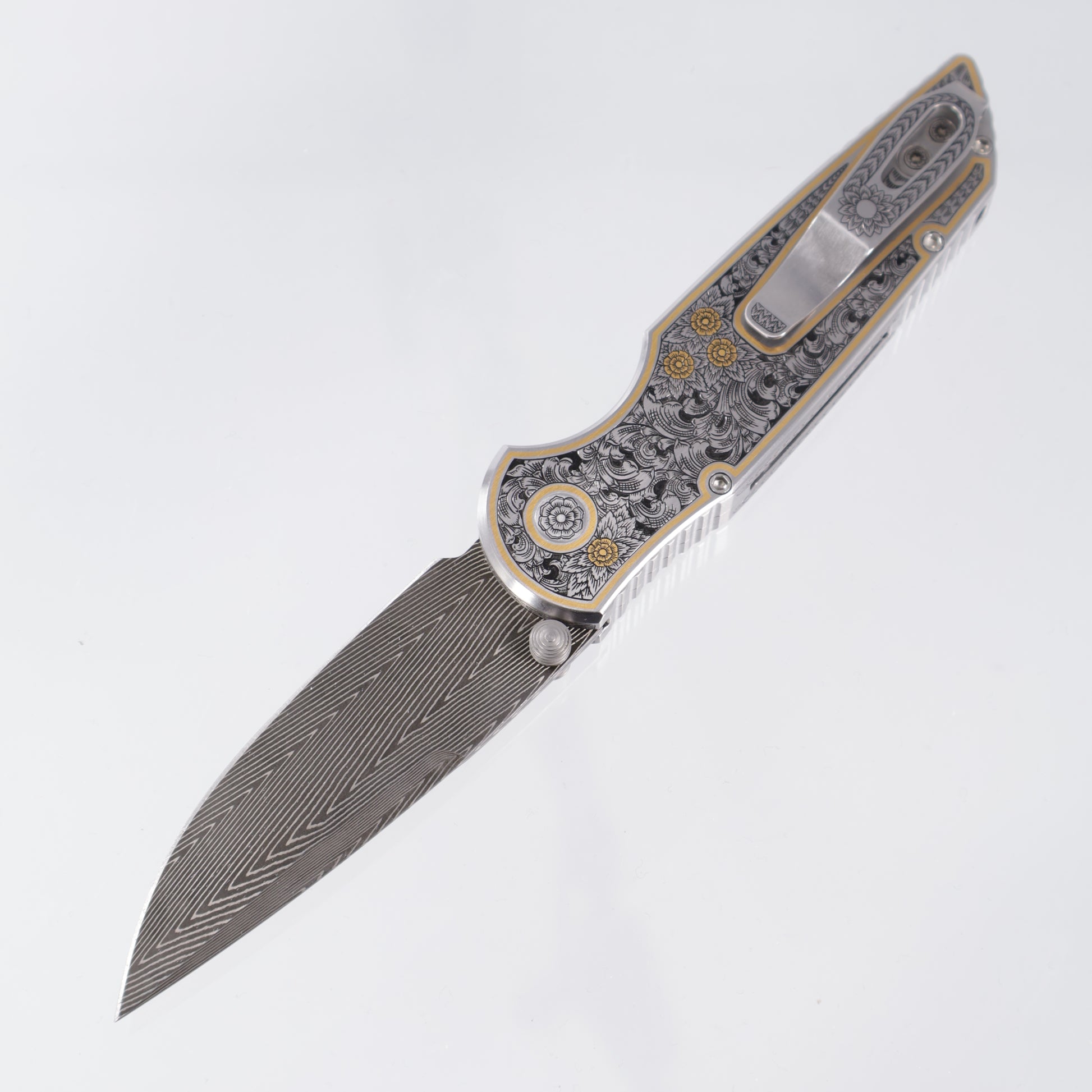 Pro-Tech TR-3 Integrity Gold & Steel Ultimate Custom #4 - Hand Engraved Deluxe Leafy Scroll Stainless chassis by Bruce Shaw w/ 24kt Gold Hand Sculpted Eagle inlay - Happy Jewelers Custom Mosaic Diamond button - Vegas Forge Carbon Herringbone Damascus