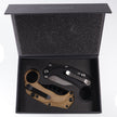 - Pivoting frame and reverse-positioned button lock that allow blade deployment with gravity and a flick of the wrist.