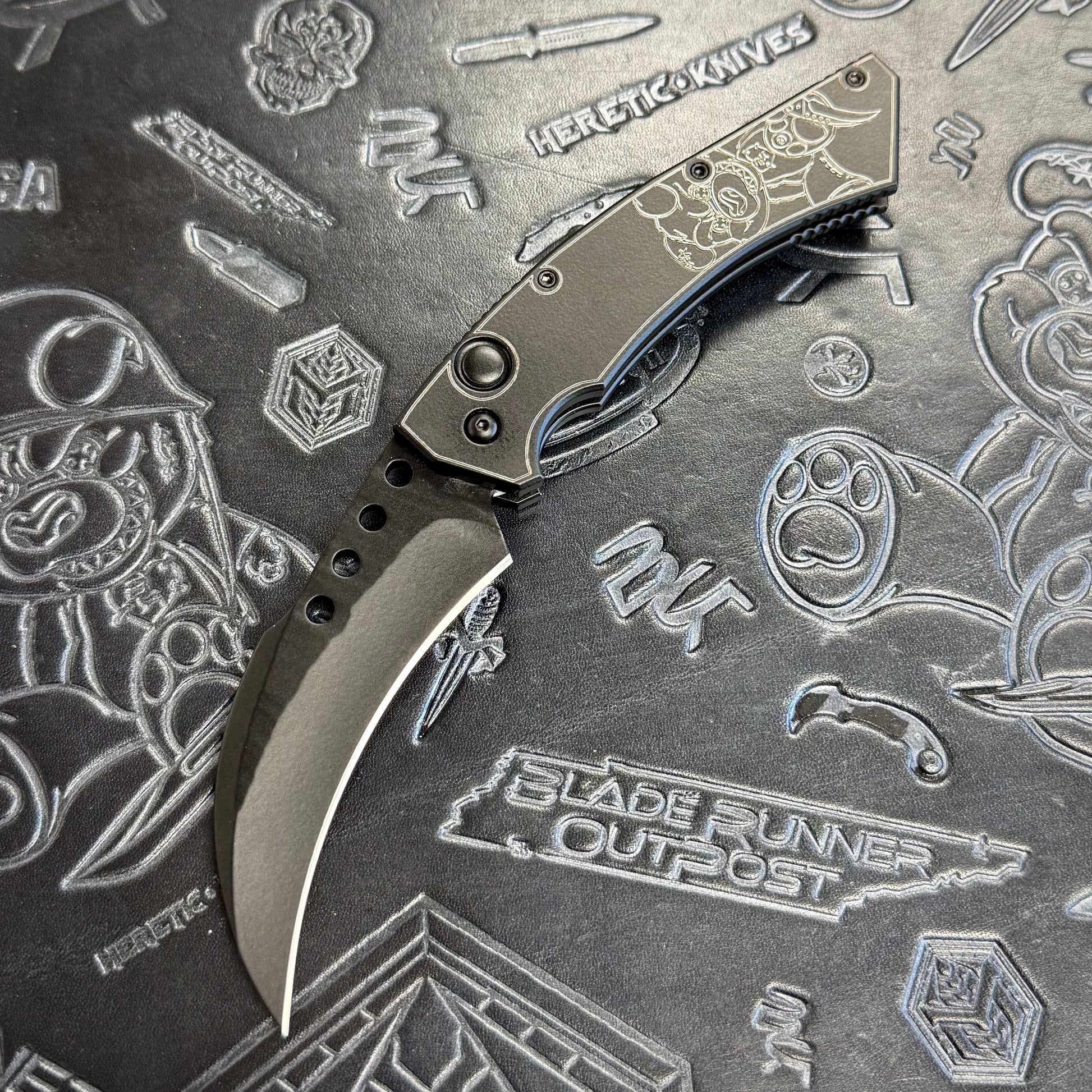 SnuggleHawk prototype S/N 001 from Reese Weiland, in collaboration with Todd Smith/TS Custom. This knife features black handle scales & Snugglez holding a RW Hawkbill laser work as well as a black tactical, rock ground Nitro-V blade!