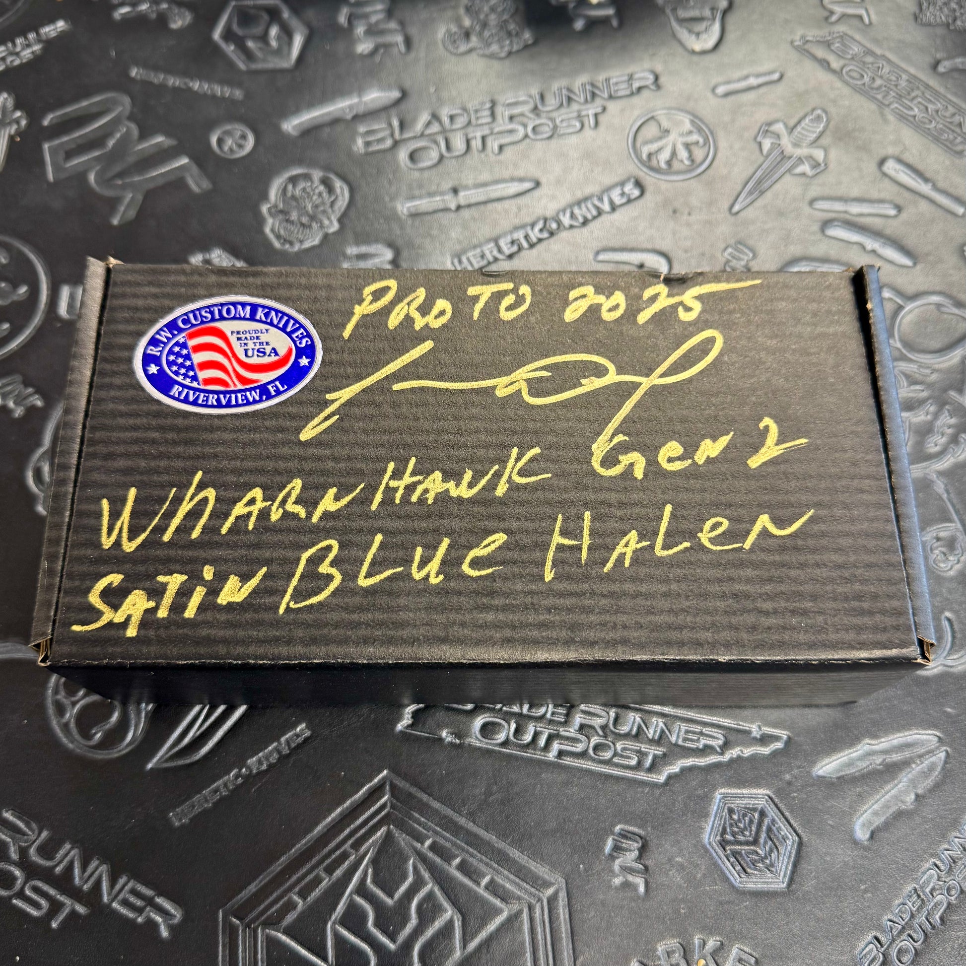 Gen2 Wharnhawk prototype from Reese Weiland, in collaboration with Todd Smith/TS Custom. This knife features bright blue handle scales & “Halen” pattern laser work as well as a satin, rock ground Nitro-V blade!
