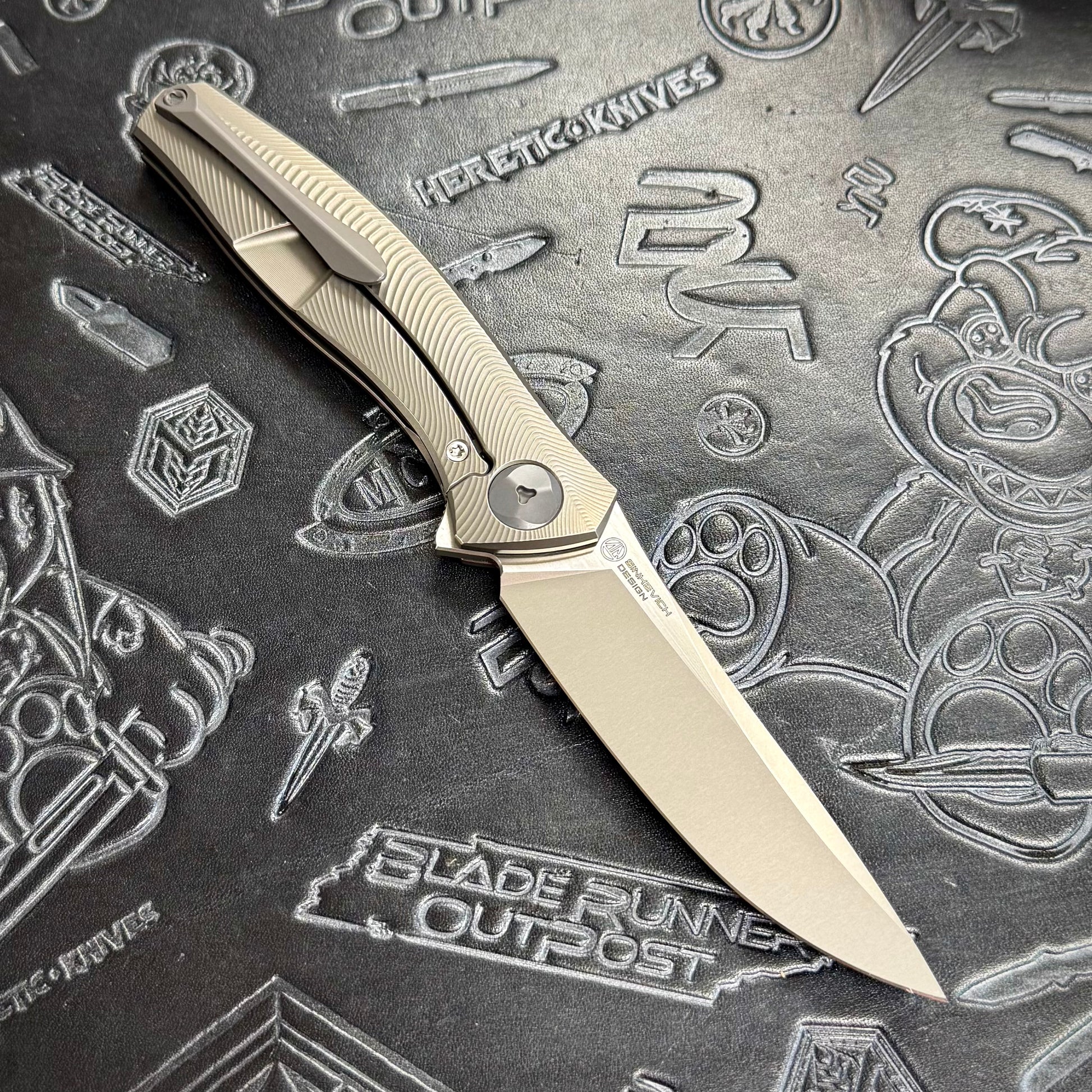 Shirogorov x Sinkevich collaboration piece! Only 300 made. Titanium handle scales, M398 blade steel & multi-row bearing system!