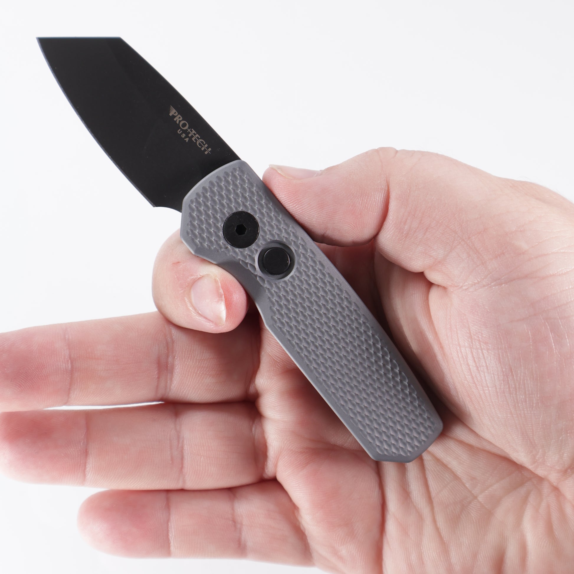 The Runt 5 automatic knife is our newest take on the classic Runt model and boy does it look good! It features the superb opening action that Pro-Tech is known for, and a sub-two-inch blade, making it legal in California. The handle is small, but well-shaped to fit the human hand, making it comfortable to hold; texturing on the back of the handle at the base of the blade makes it easy to maneuver the blade for precise cuts. This pocket-friendly auto comes with a secure pocket clip and lanyard hole and is sure to put a smile on your face each time you reach for it.