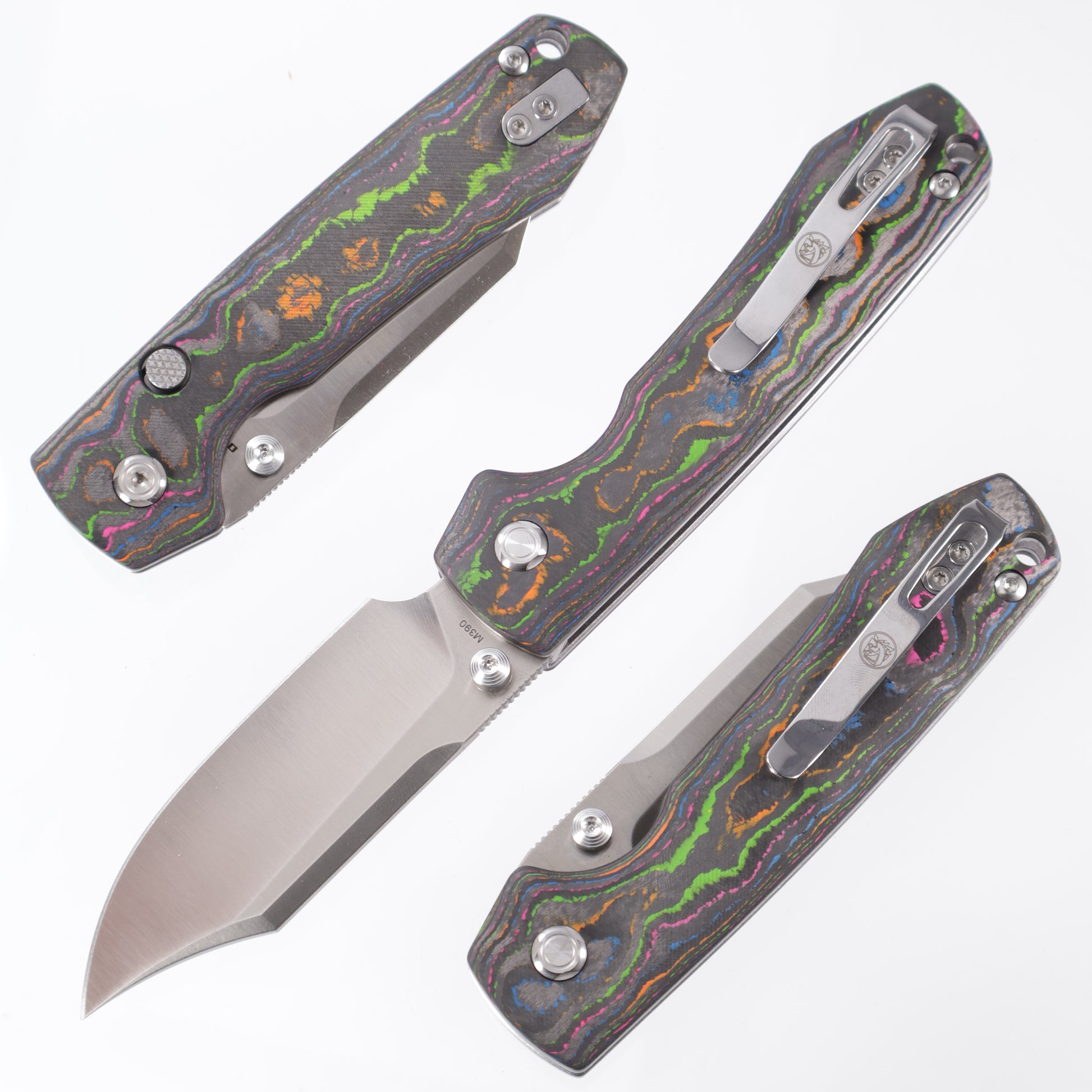 Raccoon Top Liner Lock featuring contoured 80s Camo Carbon scales, full liners for the first time, & a Satin M390 blade!