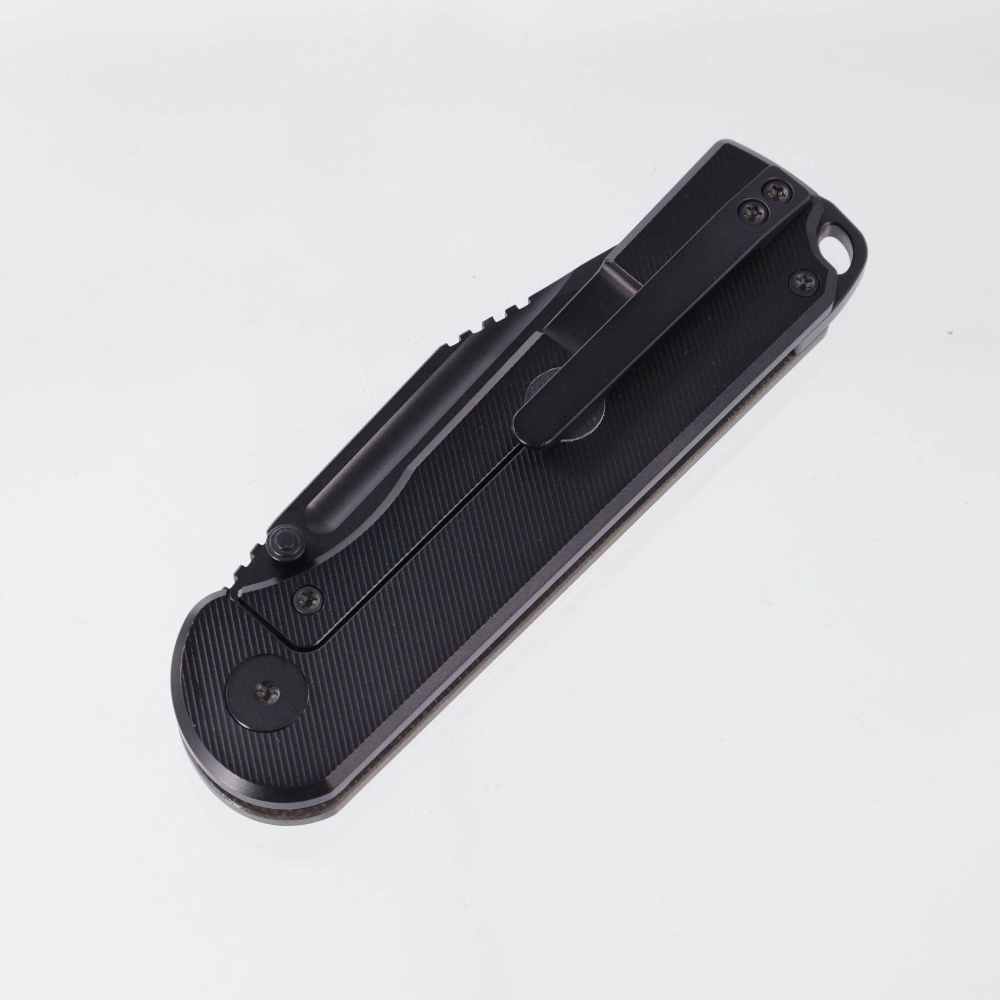 The frame is black PVD coated titanium, micro-milled for subtle grip and modern texture. The show side scale features natural micarta over a hidden titanium liner, keeping the look clean and the profile slim. Hardware is stealthy black PVD titanium throughout, and the milled titanium pocket clip is fully reversible for left or right-hand carry.