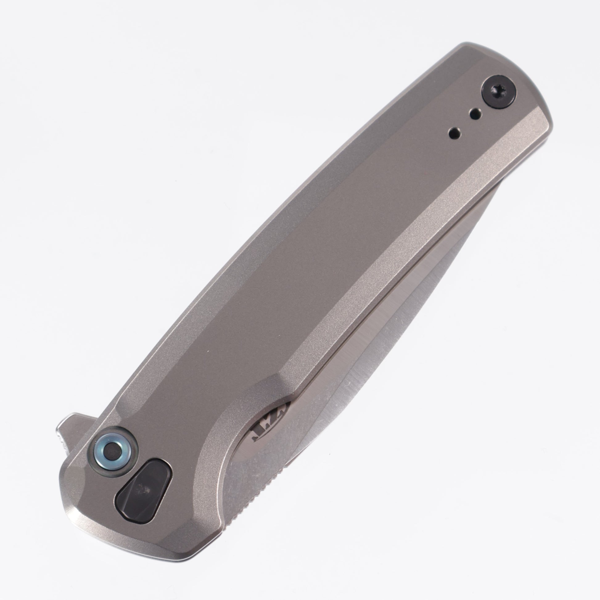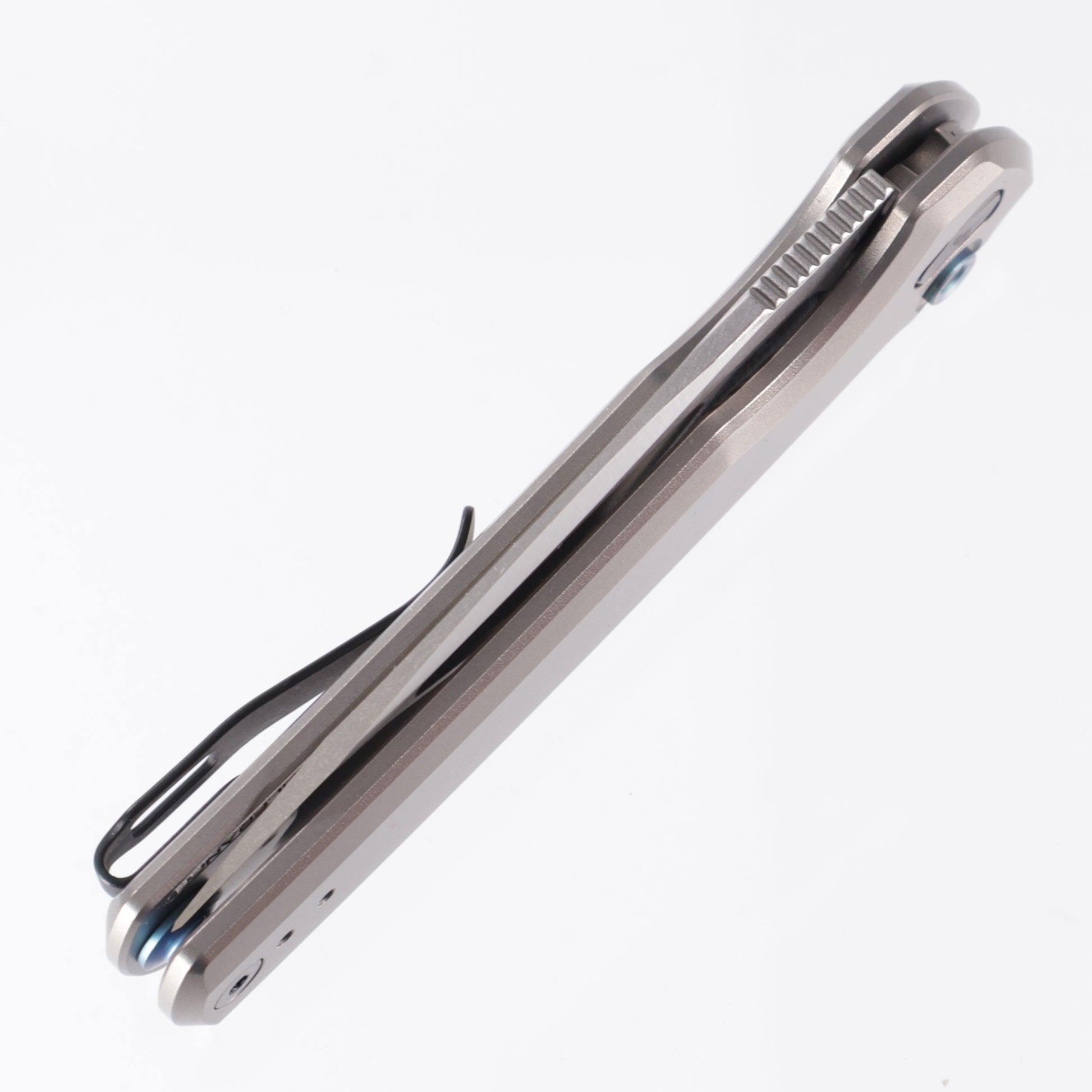 - Steel manual button lock; blade opens easily and smoothly with ceramic KVT ball-bearing system with flipper